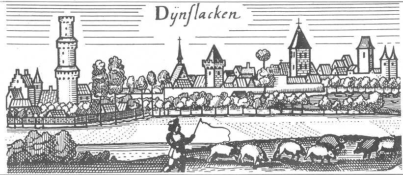 Nach Willi Dittgen im Heimatkalender Kreis Dinslaken 1950 Alte Urkunden mögen dem kundigen Forscher mancherlei berichten aus vergangenen Zeiten, doch nur wenige Fachleute finden sich in diesen vergilbten Blättern zurecht und wissen die eigenartigen Schriftzeichen zu entziffern. Vieles bleibt dunkel, manches überwuchert die Phantasie und die Sage. Da bringt oft das Bild mit überraschender Anschaulichkeit die Klärung und offenbart die Wirklichkeit in vielen Einzelheiten, die Urkunden bisher verschwiegen haben. Ein schönes Beispiel ist dieses Bild vom alten Dinslaken, das um 1600 ein unbekannter Künstler zeichnete und das uns als älteste bildliche Darstellung der Stadt besonders wertvoll ist. Es handelt sich um einen Kupferstich in der Größe einer Postkarte. Das Bild wurde von Willi Dittgen im Jahre 1949 in der umfangreichen Sammlung des Notars Angerhausen in Rheinberg gefunden. Lasst uns nun dem Zeichner über die Schulter schauen und sehen, welche Einzelheiten sein Stift auf dem Papier festgehalten hat. Wir befinden uns westlich der Stadt, ungefähr dort, wo heute das katholische Krankenhaus steht, und schauen über die Felder, die zum Brinkerkamp gehören, zum Rotbach hinunter. Hier befand sich auch das sogenannte kleine Bruch, "dat klyne Broichsgen büssen der Eppinghaven Portzen gelegen". Eben treibt ein Hirte, den Mantel über die Schulter gerollt, eine Schweineherde ins Averbruch. Vielleicht gehört sie auch zu dem großen Hof Bärenkamp, der damals im Besitz der Familie Ingenhoven war. Weiter hinten fließt, von Baumreihen umsäumt, "die Beek", der Rotbach. Er zog in mehreren Armen durch und um Dinslaken und versorgte sämtliche Gräben der Stadtbefestigung mit Wasser. Ein Arm trieb die Wassermühle am Altmarkt; und wurde daher auch "Müllenbeek" genannt. Auf einer Karte des Jahres 1659 ist der Bach als "Churfürstl. Möhlenbach, der Leygrabe genannt", bezeichnet. Der Bach war außerordentlich fischreich und mancher alte Dinslakener wusste 1950 noch zu erzählen, wie er als Junge armlange Hechte hier gefangen hat. Deutlich ist auf dem Bilde die Stadtmauer zu sehen, die damals noch den ganzen Ort umschloss und dem Bürger in Kriegszeiten Schutz vor Überfall und Plünderung gab. Heute sind noch Reste an der Grünanlage am Rotbach zu sehen. Damals war die Mauer etwa 3 m hoch und wurde in Abständen von 10 m durch breite äußere Strebepfeiler gestützt. Dinslaken bestand aus zwei Bezirken, der Altstadt und der Neustadt. Zu letzterer gehörten die Häuser, die zwischen der heutigen Hauptstraße und dem Neutor und zwischen Wallstraße und Rutenwall lagen. Sehr wahrscheinlich hatte nur die Altstadt einen festen Mauerring, während man sich zum Schutz der Neustadt mit Wassergräben und Pallisaden begnügte. Die Unterhaltung der Befestigungen war sehr kostspielig und die Einwohner mussten immer wieder zu Sonderabgaben für diesen Zweck herangeholt werden. Im. Jahre 1502 erlangte der Magistrat das Recht, eine Biersteuer zu erheben. Außer der gewöhnlichen Gruitabgabe, die in die herzogliche Kasse floss, sollte von jedem Fass ein Stüber entrichtet werden. Der Betrag wurde zum großen Teil für die Instandsetzung der Stadtbefestigung verwandt. |