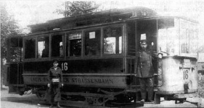 Triebwagen Nr. 16 der Kreis Ruhrorter Straßenbahn, mit Fahrer und Schaffnerin. Einsatzort: Linie Dinslaken-Meiderich. (Quelle: Kreisarchiv Wesel) Etwas schwieriger gestalteten sich die Verhandlungen mit den Anliegern wegen der notwendigen Grundstückskäufe. Erst 1911 konnte die Bahn am damaligen Rathaus vorbei zum Bahnhof gelegt werden. Die damals für Dinslakener Verhältnisse breite Friedrich-Ebert-Straße ist auch heute noch ein eindrucksvoller Beweis dafür, dass die Mannen um Baurat Nottebaum planten, wenn auch gegen den Widerstand der noch in kleinstädtischen Perspektiven denkenden Ratsmitgliedern, weitsichtig planten. 1910 wurde die Straßenbahnstrecke Neumühl-Walsum-Dinslaken mit Unterstützung von RWE und Stadt Duisburg von der 1893 gegründeten „Kreis Ruhrorter Straßenbahn AG“ aufgekauft, die wiederum 1940 in die Duisburger Verkehrsgesellschaft (DVG) aufgegangen ist. In den folgenden Jahrzehnten wurde das Straßenbahnnetz immer weiter ausgebaut und verbessert, so dass man heute bequem und schnell von Dinslaken nach Duisburg gelangen kann.