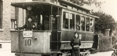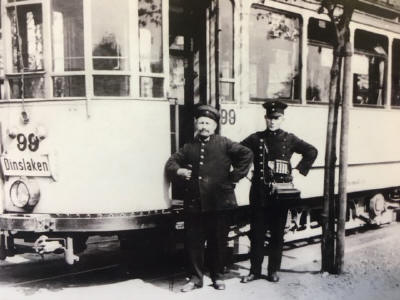Paul Müller, Fahrer, mit einer Schaffnerin circa im Jahr 1914 an der Rheinstraße auf Höhe des Fischrestaurants Langhoff an der damaligen Endhaltestelle. Foto: Archiv Heimatverein Walsum 1899 haben die Walsumer mit dem Verlegen der Straßenbahnschienen nach Hamborn begonnen. Kurz nach Start des Fahrbetriebs kippt die erste Bahn um. Seit rund 120 Jahren können sich die Bürger im Duisburger Norden auf den öffentlichen Nahverkehr verlassen. Damals gehörten Hamborn und Walsum freilich noch nicht zu Duisburg – sie waren selbstständige Gemeinden. Die Idee, die alte Postkutsche zu ersetzen, die von Duisburg über Meiderich über Walsum nach Dinslaken fuhr, entstand Ende des 19. Jahrhunderts.