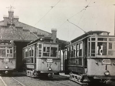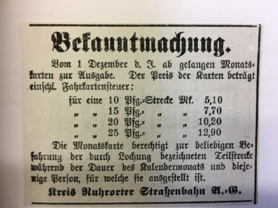 Am 30. November 1907 ist diese Bekanntmachung veröffentlicht worden. Fahrten mit der Bahn kosteten 10, 15, 20 oder 25 Pfennig. Fahrgäste konnten die Karten auch im Monatsabo kaufen. Foto: Archiv Heimatverein Walsum Straßenbahnen der Kreis-Ruhrorter-Straßenbahngesellschaft, zu sehen im Depot Walsum vermutlich in den 1910er oder 1920er Jahren. Hier im Bild Wagen 16 (nach Dinslaken) sowie Wagen 1 und 17 (Meiderich). Foto: Archiv Heimatverein Walsum