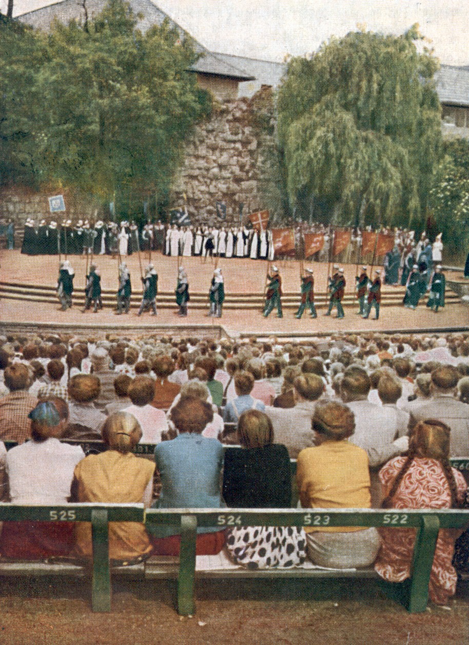 Das Burgtheater - ein Wahrzeichen der Stadt Dinslaken Die Freilichtarena am Fuße des Rathauses ist nicht nur für alle Dinslakener ein Begriff, sondern auch weit über die Grenzen der Stadt hinaus bekannt. Was für Köln der Dom, ist für die Stadt im Grünen das Burgtheater. Fotografierende Touristen werden zwar selten gesichtet, aber zu den Saisonhöhepunkten liefen und laufen immer noch zahlreiche Zuschauer von Niederrhein und aus dem gesamten Ruhrgebiet in die multifunktionale Spielstätte ein. Wenige Monate nachdem der "Verein für Heimatkunde und Verkehr Kreis Dinslaken" den Beschluss gefasst hatte, eine Freilichtbühne zu bauen, konnte am 18. August 1934 das Burgtheater der Öffentlichkeit übergeben werden. Die Dinslakener waren begeistert von der Stätte und den sonntäglichen Aufführungen. Bis zu 80.000 Menschen kamen jährlich. Selbst im Krieg wurde bis 1944 vor dichtbesetzten Rängen gespielt. |