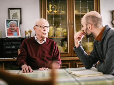 Jaap Robben im Gespräch mit Walter Holona. Foto( André Hirtz Es ist nicht so, dass ich Herrn Holona nicht vertraue, aber diese Geschichte ist so vielschichtig, dass ich nicht weiß, wo ich anfangen soll, um ein vollständiges Bild zu erhalten. Man kann nicht einfach nur über das Ende des Zweiten Weltkriegs reden, ohne auch den Rest zur Sprache zu bringen. Aber wie kann man in anderthalb Stunden die schrecklichsten, komplexesten und intensivsten Jahre im Leben eines Menschen besprechen? Worüber sollte ich weiterfragen, ohne dass es wie ein Polizeiverhör wirkt? Was weiß ich überhaupt darüber? Ich parke mein Auto und betrachte den Häuserblock. Ich denke darüber nach, dass Herr Holona seinen Brief selbst geschickt hat. Dass er wahrscheinlich gerne reden möchte. Vielleicht sollte ich erst mal damit beginnen, zuzuhören. Schon bevor wir uns an seinen Esstisch setzen, fängt er an zu erzählen. „In Kranenburg war niemand mehr. Ich saß mit einigen Soldaten im Keller des Tierarztes. Dort haben wir etwas zu essen gefunden. Und Laken, mit denen wir einen Schlafplatz gemacht haben.“ Die Worte kommen hastig aus seinem Mund, als wären sie zu lange eingesperrt gewesen. Manchmal sagt er mitten in einer Schilderung: „Oh ja, das muss ich auch erzählen.“ So springen wir von der Normandie in die klirrende Kälte der Ukraine, über Kranenburg zurück nach Essen. Viele Geschichten enden mit: „Ich hatte hundertmal Glück.“ Jenes Mal, als er weggerufen wurde und eine Granate genau dort in der Kolonne explodierte, wo er gerade noch marschiert war. Oder ein anderes Mal, als er mit einem verheirateten Soldaten in einem Bunker saß. Dieser Mann hatte Kinder, also musste Holona hinausgehen, um eine Botschaft zu überbringen. Kurz danach fiel eine Bombe auf den Bunker. „Ich hatte hundertmal Glück.“ Das fühlt sich bitter an, denn neben Holonas Glück sprechen wir nicht über jene anderen Soldaten. Junge Männer, die seit mindestens fünfundsiebzig Jahren unter grauen Grabsteinen liegen. Erinnerungen an Reibekuchen in Kranenburg „Haben Sie schon mal Reibekuchen gegessen?“, fragt er plötzlich. „Äh...“, stottere ich. „Mit Kakaobutter?“ „Werden Sie den jetzt zubereiten?“ „Nein, nein.“ Er lächelt breit. „Den haben wir in Kranenburg gemacht. Wenn man ihn schnell gegessen hat, war er ganz in Ordnung. Aber wenn man zu lange gewartet hat, wurde er ungenießbar.“ Mir ist klar, dass sich seine Geschichten in den letzten fünfundsiebzig Jahren von Erlebnissen zu Erinnerungen und dann zu bündigen Anekdoten gewandelt haben müssen, die immer mit einem Lächeln und mit „Ich hatte hundertmal Glück“ enden. „Aber Sie waren achtzehn Jahre alt, als Sie eingezogen wurden“, unterbreche ich ihn. „Und zweiundzwanzig als der Krieg vorbei war. Sie müssen in jungen Jahren schreckliche Dinge erlebt haben.“