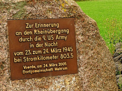 Ein unweit des Deichs aufgestellter Gedenkstein mit Tafel erinnert an den Rheinübergang der Alliierten vor 75 Jahren. Foto: Heiko Kempken |