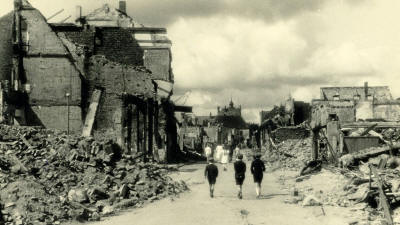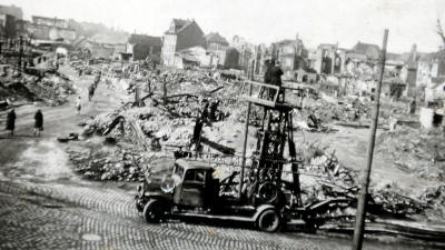 Bei dem Angriff der Alliierten am 23. März 1945 wurde die Dinslakener Innenstadt zerstört. Foto: Stadtarchiv Dinslaken 511 Menschen fanden beim Bombenangriff der Alliierten den Tod. 80 Prozent der Stadt wurden zerstört – darunter auch die St.-Vincentius-Kirche. Es war ein heller wolkenloser Tag, ein wunderschöner Frühlingsmorgen. Der Krieg schien an diesem Morgen fern zu sein, Frauen nutzten den Morgen, um sich und ihre Familien mit den nötigsten Lebensmitteln zu versorgen. Es war die Ruhe vor dem Sturm, an jenem Frühlingsmorgen des 23. März, der ein schwarzer Freitag für Dinslaken werden sollte. Mit enormem Materialaufwand nahmen die Alliierten den Angriff auf die Hauptkampflinie Rhein vor. Seit Monaten waren die Dinslakener Luftangriffen, Geschützdonner und Tage zuvor dem Artilleriebeschuss ausgesetzt. Ohne Vorwarnungen brach es über Dinslaken hinein Doch der 23. März 1945 sollte zu einem Inferno werden. Ohne Vorwarnungen, die ersten Bomben hatten wohl die Stromzufuhr zu den Sirenen unterbrochen, brach es über Dinslaken herein. Der damals neunjährige Hermann Hagenacker hatte vom Rutenwall aus drei Flugzeuge am Himmel bemerkt. Nichts Ungewöhnliches in diesen Tagen. Er schreibt dazu in Friedhelm van Laaks Buch „Erleben und Überleben“: „Aber auf einmal ist alles ganz anders. Noch bevor es passiert, fängt die Luft an zu sirren und schwingen. Ein eisiges Gefühl von Gefahr verbreitet sich. Und dann die ersten Einschläge, mitten in der Innenstadt. Wir sind dran!“ Im Schutzkeller fing der Junge an zu beten. „Mein Gott, muss ich jetzt sterben? Ich bin doch noch so jung. Das kannst Du doch nicht wollen. Lass mich am Leben. Ich habe doch nichts Böses getan. Lieber Jesus, hilf mir doch. Ich habe solche Angst.“ Änne Lettgen sah von ihrer Haustür aus hinter der Villa Wienert schwarze Rauchwolken aufziehen. Zuerst hielten sie und ihre Mutter es für ein Gewitter, dann aber fiel es Änne Lettgen wie Schuppen von den Augen: „Mama, sie kommen“, rief sie aufgeregt. Doch die Mutter blieb ruhig: „Das kann nicht sein. Ich habe gerade erst die Fenster geputzt...“ Doch das war den Amerikanern wohl egal. |