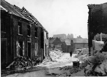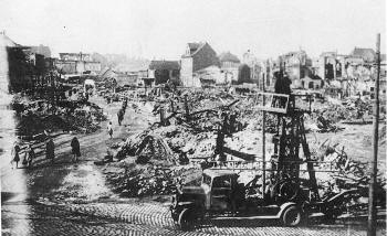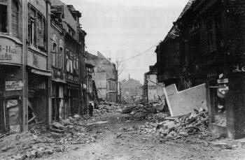 Das Ende des Krieges vor Augen erlebten die Dinslakener den schwärzesten Tag in der Stadtgeschichte: am 23. März luden hunderte alliierte Flugzeuge in immer neuen Angriffswellen einen Bombenteppich ab. Mehr als 800 Einwohner kamen dabei ums Leben. Das Gesicht der Stadt wurde auf das furchtbarste verwüstet. Schon bald nach der Zerstörung regten sich jedoch fleißige Hände. In der Zeit vor 1948 konnten nur verhältnismäßig wenige Wiederaufbauten gelingen. Dennoch ist gerade für diese Zeit zu vermerken, mit welchem zähen und unermüdlichen Fleiß sich die Bürger der Stadt und ihre Helfer unter den denkbar schwersten Umständen sozusagen mit nackten Händen an die Beseitigung der Trümmer, an die Freimachung der Straßen und an den Wiederaufbau begaben. Der Schadensgrad von 74 % Zerstörung in der Stadt ergab das Bild einer Wüstenei, so dass sich mit der Freimachung der Straßen und der Trümmerräumung bereits ein Gefühl neuer Ordnung einstellte. Trotzdem waren die Wiederaufbauten bis zur Währungsreform nur vereinzelt zu zählen. Nach dem Bericht des damaligen Beigeordneten Klaus Ewers aus dem Jahre 1955 stieß die Wiederaufbauplanung auf viele Schwierigkeiten. Der Grundbesitz war stark parzelliert und eng verschachtelt. Durch Erbteilungen waren die unterschiedlichsten Eigentumsverhältnisse entstanden. Eine besondere Erschwerung brachten die Verfahren nach dem Rückerstattungsgesetz in sofern ehemals jüdisches Eigentum von Gesetzes wegen der Rückerstattung unterlag. Diese Verfahren haben z. T. Jahre benötigt, ehe dem Eigentümer wieder Verfügungsfreiheit zustand und damit freie Bahn für die Neuordnung der Grundstücke geschaffen war. Man mag über den zeitlichen Ablauf der Wiederaufbauplanung eine kritische Meinung haben, anerkennend ist jedoch zu erwähnen, dass die erforderlichen Grundstücks-umlegungen zwischen Hauptstraße (heute Friedrich-Ebert-Straße) und Neutorplatz fast ausnahmslos auf freiwilliger Grundlage durchgeführt werden konnten. Die Wiederaufbauplanung musste auf eine große Zahl von Voraussetzungen gegründet werden, ehe sie rechtsverbindlich festgelegt werden konnte. Im Wesentlichen waren folgende Gesichtspunkte für den Rat- und die Stadtverwaltung maßgebend gewesen: 1. Entsprechend dem früheren Charakter der Innenstadt entschloss man sich, die gesamte Neustraße und die Duisburger Straße einschl. Altmarkt verhältnismäßig eng und geschlossen zu gestalten, womit ein Zentrum der Geschäftswelt und eine Konzentration bequemer Einkaufsmöglichkeiten gewährleistet wurde. Die Sorge der Stadt bezog sich dabei uneingeschränkt auf all e Anlieger dieser beiden Straßenzüge. 2. War der Entschluss endgültig, die Neu- und Duisburger Straße verhältnismäßig eng wiederaufzubauen, dann war damit zu rechnen, dass ein Verkehrsproblem eintrat und zu bewältigen war. Man kann sicherlich heute noch nicht sagen, dass es bewältigt ist. Gewonnen wäre aber schon mit der Einsicht, dass beide Straßen in erster Linie für eine gefahrlose und bequeme Benutzung durch den Fußgänger, der das Gros des Käuferpublikums aller Einzelhandelsgeschäfte darstellt, zur Verfügung stehen müssen. Die Regelungen des Endzustandes hängt eng mit dem Erfordernis zusammen, dass die Anlieferung für die Geschäfte der „Neustraße“ seitlich am Rutenwallweg bzw. an der Klosterstraße und ihrer Fortsetzung auf die Bahnstraße zu erfolgt. Darüber hinaus ist es das Ziel der Stadt, durch gelegentliche Durchbrüche auf die Seitenstraßen Verkehr zu- und abzuleiten und das erreichen der Parkplätze zu erleichtern. |