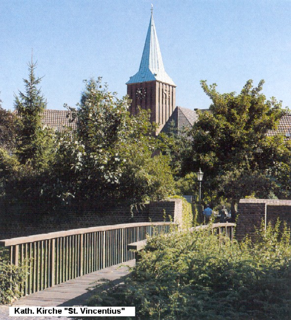 Märtyrer starb. Bereits vor Erhebung zur selbständige Pfarrgemeinde gehörte zu der damaligen Curatkapelle auch ein Friedhof. Erst Anfang des 19. Jahrhunderts wurde durch Errichtung eines neuen Friedhofs die Bestattungen im Bereich der Kirche eingestellt. Heute erinnert lediglich eine Bronzetafel und ein eingezäuntes Areal am Ostchor der Kirche an den ältesten Friedhof Dinslakens. Der dreischiffigen Hallenkirche war ursprünglich im Westen ein Turm vorgesetzt, dem in den Jahren 1492 und 1512 zu beiden Seiten je eine Kapelle angefügt wurde, die den Heiligen Sebastian und Antonius geweiht waren. Im Laufe der Jahrhunderte wechselte die Turmhaube mehrfach ihre Gestalt. Auf dem Kupferstich von 1650 hat sie die Form einer Pyramide. In den Jahren 1817/19 erhielt der Turm eine hölzerne Haube, die im Jahre 1924 durch eine hohe barockisierende Zwiebelform ersetzt wurde. |