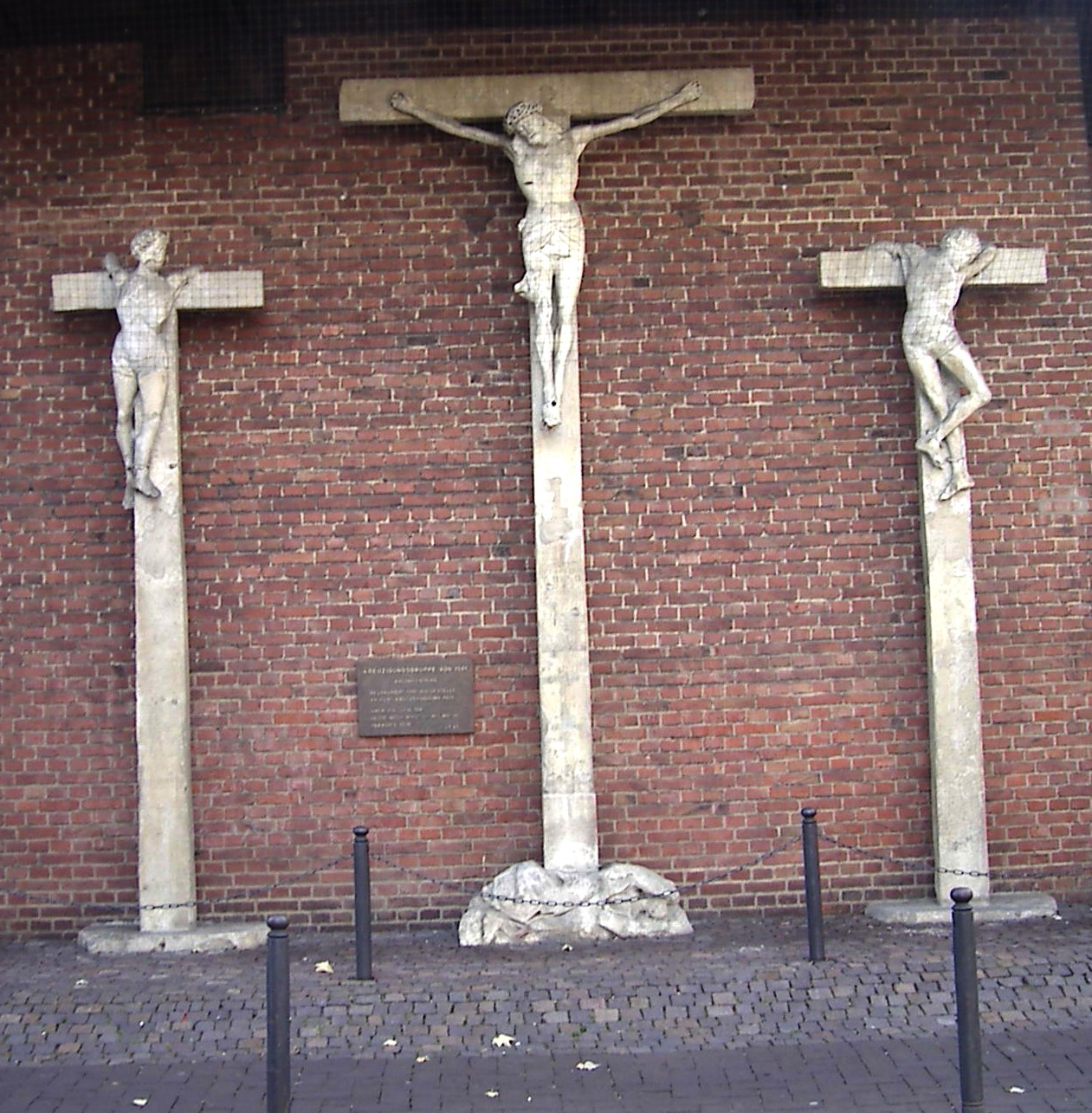 als Ruine erhalten geblieben. Der Wiederaufbau wurde in den Jahren 1950/51 durchgeführt. Die Kirche wurde im Westteil erneuert und beträchtlich erweitert. Der Boden im alten Teil wurde angehoben und das neue Querschiff tiefer gelegt, so dass der Hochaltar, in der neuen, großen, runden Westapsis aufgestellt, stärker als zuvor in den Blick aller Kirchenbesucher rückte. An der Nordseite des Kirchturm befindet sich die Kreuzigungsgruppe von 1507 aus Sandstein. Die Kreuzigungsgruppe, die zu den bedeutensten ihrer Art zählt, hat ihre eigene Geschichte und wurde erst im Jahre 1986 aus konservatorischen Gründen an der Kirche aufgestellt. Kopien dieser Kreuzigungsgruppe stehen heute an dem ursprünglichen Standort der Originale, am Kreisverkehr neben dem evangelischen Krankenhaus.