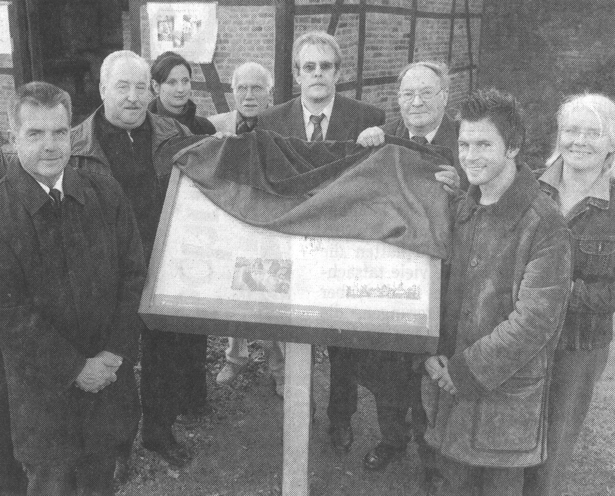 Die Tafel wird enthüllt. (v.l.) Ulrich Schneidewind, Sparkasse, Klaus Dieter Graaf, Kulturamt, Bianca Germann, Winfried Schubert, Dr. Ulrich Tekathen, stellv. Bürgermeister Werner Rodermond, Jens Müller, Karin Schneider.
