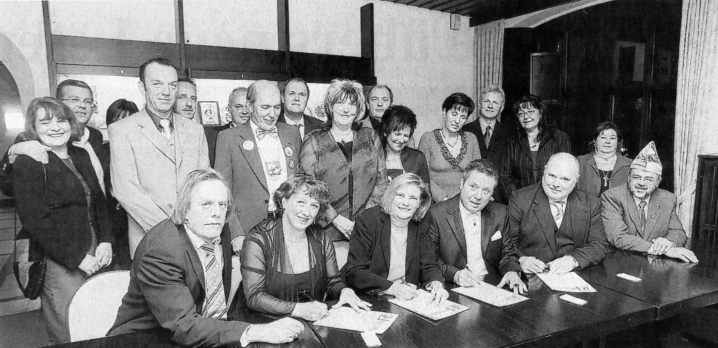 Doch noch sind zwei Stühle am runden Tisch leer. Lierop wiederholte die Einladung an den DKV Blau-Weiß und den HCC, dem Festkomitee beizutreten. "Karneval ist Kultur, und die Kultur ist das Herz eines Volkes", erklärte Dieter Seedorfer, Präsident des Landesverbands Rechter Niederrhein im Bund deutscher Karneval. "Man spürte in deiner Rede, dass dir das Herz überquoll", so Sabine Weiss zu Egon van Lierop. Veranstalten und Feiern liegen im Karneval eng beieinander. Nach der Unterzeichnung der von Ronny Schneider kalligraphisch gestalteten Urkunden ließ das Festkomitee den Abend zur Musik von Dietmar Krüssmann in geselliger Runde ausklingen. DKV BLAU-WEISS & HCC FEHLEN AM TISCH Der DKV Blau-Weiß und der Hiesfelder Carnevals Club sind dem Festkomitee nicht beigetreten. Sie kritisieren Gründungsprozess und Strukturen des neuen Vereins. Der Wahl des Präsidenten sei keine Kandidatensuche durch alle Vereine vorher gegangen, die Möglichkeiten der Vereine, Entscheidungen im Festkomitee mit zu treffen, sei durch die Stimmrechtsvergabe zu stark eingeschränkt. Die Satzung sieht vor, das juristische wie natürliche Personen, d.h. Vereine genau wie Einzelpersonen nur ein Stimmrecht haben. Beiträge würden allerdings, so der HCC, pro Mitglied des jeweiligen Karnevalsvereins erhoben. DKV und HCC entschieden sich aus den genannten Gründen gegen den Beitritt zum Festkomitee in den aktuellen Strukturen. Der DKV wünscht sich darüber hinaus, dass im jährlichen Turnus jeder Mitgliedsverein ein Prinzenpaar für das Festkomitee stellt und das Veranstaltungsangebot ausgeweitet wird. Das Festkomitee müsse sich zu einem echt gemeinsamen Dachverband entwickeln. Viel Stoff für Diskussionen, damit der Straßenkarneval in Dinslaken bald wieder in den Farben aller ortsansässigen Vereine glänzen kann. BETTINA SCHACK, NRZ 21.11.2007