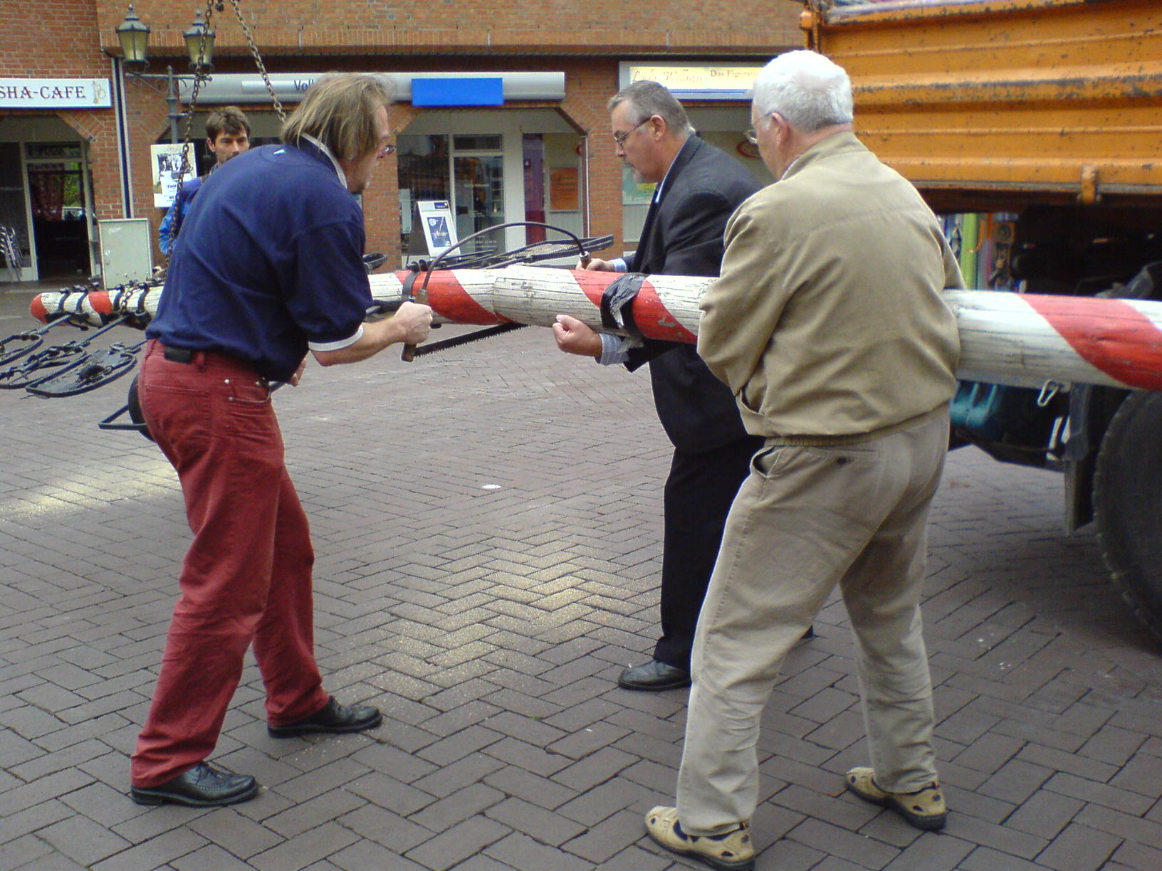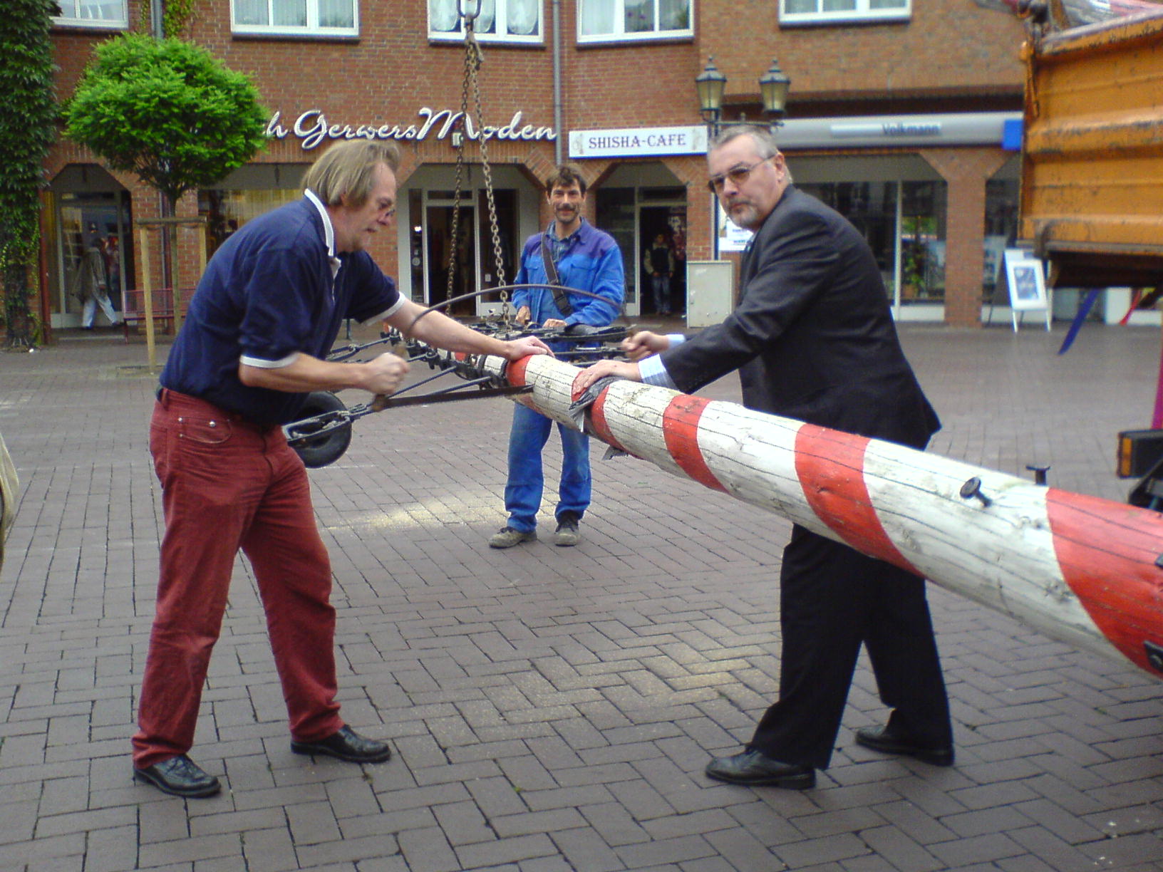 IG Altstadt zersägt Maibaum Der auf dem Altmarkt aufgestellt Maibaum ist verschwunden. Dr. Ulrich Tekathen, Vorsitzenden der Interessengemeinschaft Altstadt Dinslaken, hat ihn vor den Augen erstaunter Bürger persönlich zersägt. Unterstützt haben ihn die Vorstandskollegen Wolfgang Krüsmann, Jörg Salawarda, Dieter Waldenhoff und Erich Weichert. Selbstverständlich handelte es bei der Aktion nicht um mutwillige Zerstörung. Der Stamm war stellenweise morsch. Mit Hilfe der Firma Kahmann wurde der Stamm aus seiner Halterung gehoben und nach dem Zersägen nach Möllen zur Werkstatt des Schmiedemeisters Lutz Isselhorst gebracht. Hier liegt seit einigen Tagen ein von den Stadtwerken gestifteter stählerner ehemaliger Lampenmast und wartet auf seine Umarbeitung zum neuen Maibaum. Nach der Anbringung der Zunftzeichen und einiger technischer Finessen wird Malermeister Jörg Salawarda den Mast vor seiner Aufstellung noch farblich gestalten. Die Interessengemeinschaft ist zuversichtlich, dass der Mast spätestens zum 1. Advent eingeweiht werden kann. RP 07.09.07 |