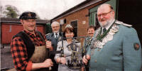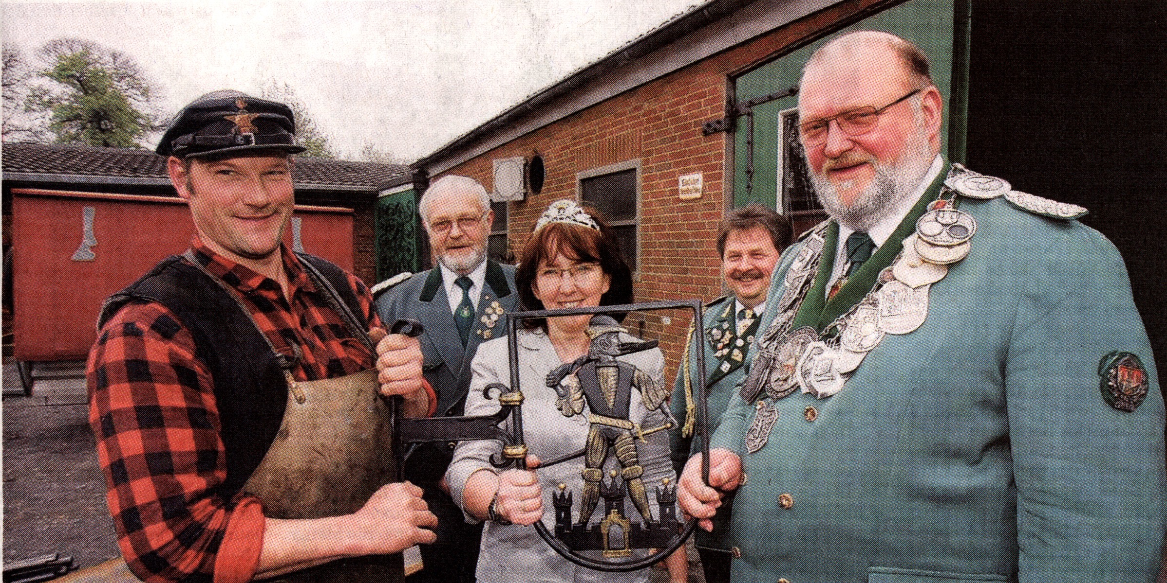 Für den Dinslakener Maibaum: Das Gildezeichen der Schützen Lutz Isselhorst hat es in seiner Kunstschmiede in Möllen wieder geschmiedet. Gestern konnten es Christa Salawarda und Jürgen Schnier, das amtierende Königspaar der Dinslakener Bürgerschützen 1461, begleitet von Gerhard Latz und Jörg Salawarda, in Empfang nehmen. Das neue Zunftzeichen für den Maibaum, der auf dem Dinslakener Altmarkt aufgestellt wird, ist das Gildezeichen der Schützen. Gestiftet wurde es von den Königen des Vereins. |