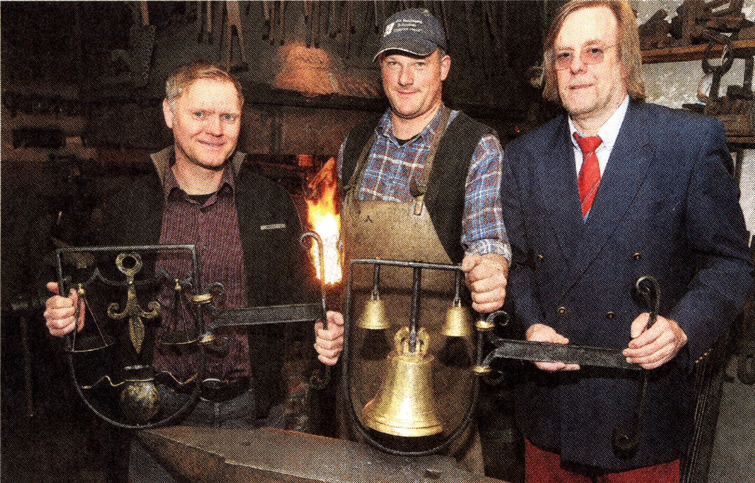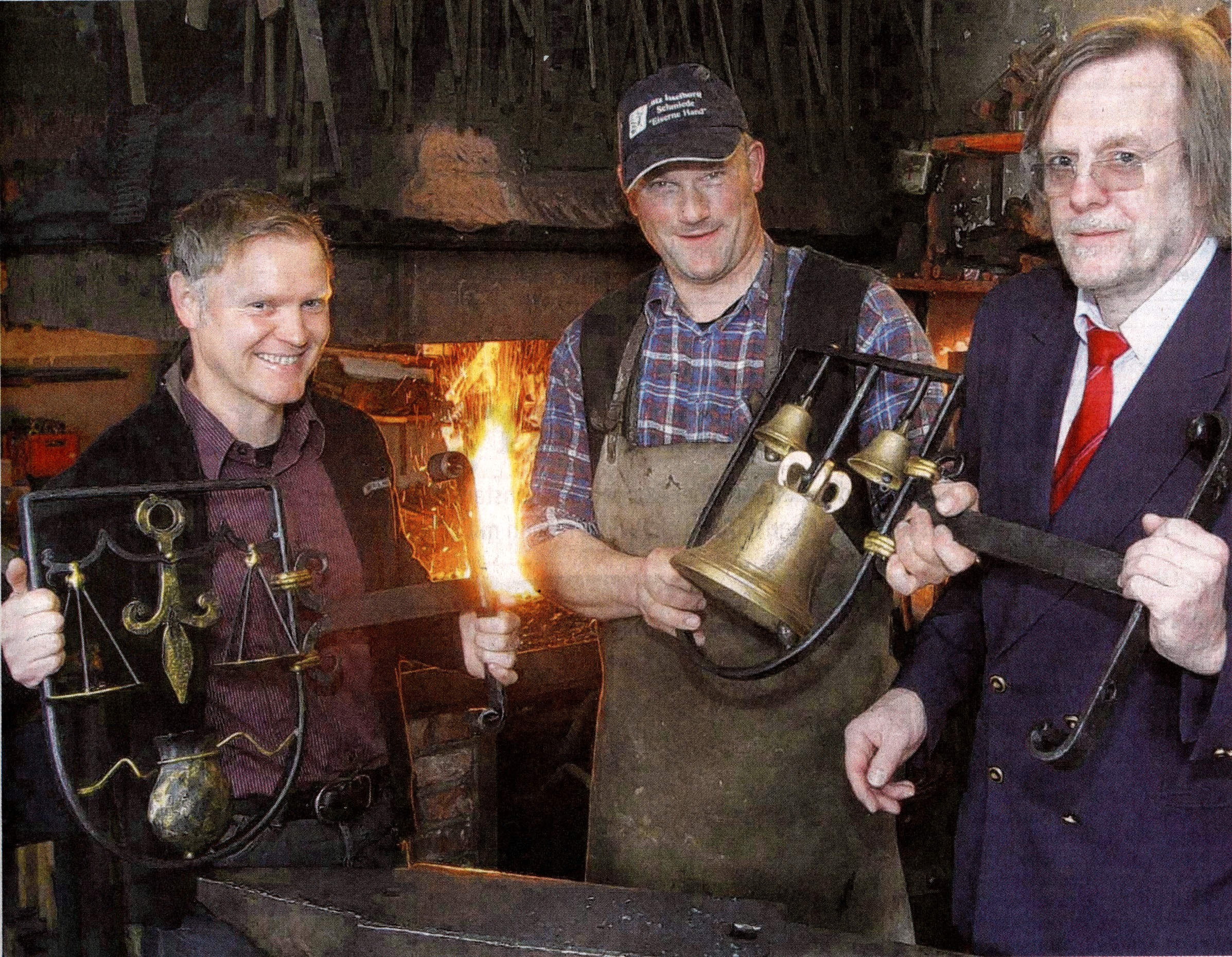 Die neuen Zunftzeichen für den Altmarkt Beim Schmied mit der „Eisernen Hand", Lutz Isselhorst (Mi.), in Möllen holte Dr. Ulrich Tekathen (re.) von der Dinslakener IG-Altstadt die neuen Zunftzeichen für den Maibaum ab. Das Symbol der Kaufleute stiftete Dieter Waldenhoff (li.). Das Zeichen der Glockengießer steuerte Ex-Bürgermeisterin Sabine Weiss bei. Foto: Heiko Kempken |