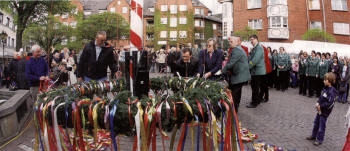 Auf dem Dinslakener Altmarkt war jede Menge los Mit vereinten Kräften des BSV Dinslaken 1461 und der Karnevalsgesellschaft Rot-Gold schaffte es der Maikranz in fünf beherzten Rucken an die Spitze des Dinslakener Maibaums am Altmarkt. Zuvor hatten der Männerchor Dinslaken 1957 und der Werkschor Pintsch Bamag die Wartezeit mit Liedern wie „Der Lindenbaum" und „Der Mai ist gekommen" überbrückt und den Wonnemonat mit der Unterstützung vieler Zuschauer und dem Lied „Komm lieber Mai“ herbei gesungen. „Seit dem Jahre 1999 ist das eine schöne Tradition", erinnerte auch Bürgermeister Dr. Michael Heidinger und lobte die Spender der vielen Zunftzeichen, die den Maibaum mittlerweile schmücken. Seine Prognose: „Wir werden das Ding schon voll bekommen." RP 01.05.2010 - FOTO: JÖRG KAZUR