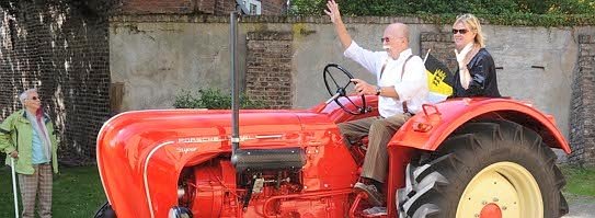 Die Idee, das historische Flair auch durch Mitwirkende in aufwendigen Kostümen auf die Straße zu bringen, griffen Birgit Gargitter und Beate Hettmer in der niederländischen Hansestadt Deventer auf. In Dinslaken führt ihr Weg von der Kirmes zum Voswinckelshof. Nein, das Museum wird noch nicht saniert. Was da tuckert und brummt, sind die Exponate der Ausstellung, die die Nostalgiekirmes auf dem Altmarkt begleitet. Auf der Museumswiese fuhren Sonntag historische Traktoren aus Dinslaken und Umgebung vor. Liebevoll restauriert und straßentauglich. Baujahr 1951, 1330 Kubik, 15 PS, luftgekühlt, 1 PS. „Was für ein Klang“, schwärmt Reiner Suchomel von seinem Deutz F1L 514/150. Ein trockener Name für den pummeligen grünen Traktor, der besonders bei Rheinländern beliebt war. „Knübbelchen“ nannten sie ihn und so nennt ihn auch sein Düsseldorfer Besitzer. Köln und Düsseldorf: passt das? „Klar, ich habe ja auch einen Bayern und einen Schweizer“. Reiner Suchomel und seine Frau Britta sammeln seit vier Jahren Traktoren. Mit verständlichem Stolz zeigt der Kaufmann einen Kalender von 2010. Sein Eicher Diesel von 1958 hat es auf das Titelblatt gebracht. Vor dem Voswinckelshof steht das Prunkstück neben Suchomels Hürlimann Bulldog von 1963. Es geht auch größer. Jürgen Dahlmann vom Porsche Diesel Club hat seinen 319 Super L mitgebracht, ein imposantes Gefährt im typischen Rot. Oder kleiner. Harold Bechingberg hat sein Nürnberger Triumph-Sachs Kleinkraftrad neben die Fahrradsammlung des Museums gestellt. Baujahr 1940, 2,25 PS. „Das Fahrgefühl ist erbärmlich“, gesteht Bechlingberg, der bis zum 69. Lebensjahr historische Motorradrennen fuhr, „aber die Entdeckung der Langsamkeit macht mir Spaß“. Motorfahrrad oder Traktor: Diese Frage stellte sich für Ingrid Hassmann am Sonntag nicht. Sie ist in bodenlangen engem Rock und schwarzer Perücke in die Rolle der Betty Tendering geschlüpft – die Literatin auf den Spuren der Autorenfreundin. Cordula Hamelmann nimmt ihre Rolle besonders stilecht. Sie trägt nicht nur einen Federhut á la Valerie Voswinckel, sondern auch ein echtes Korsett unterm züchtig hochgeschlossenen Kleid. „Immer die Haltung bewahren“, heißt es jetzt wie einst im bunten Treiben zwischen süßen Marmeladen und den Rübenkrautstullen der Hiesfelder Landfrauen und nostalgischen Bonbontüten. Bettina Schack, NRZ 21.08.2011