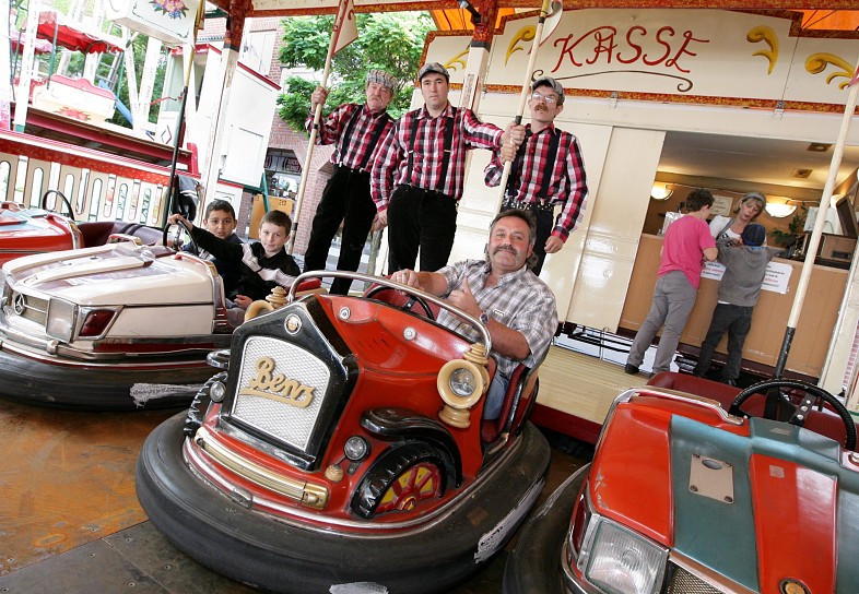 Nostalgie zwischen Holzpfosten Die Nostalgiekirmes auf dem Altmarkt lockte viele Besucher an. Eine der besonderen Attraktionen auf dem Platz: Der Holzpfosten-Autoscooter von Richard Müller. Die Sonne scheint. Ein leichter Wind weht über den Altmarkt und bewegt die Luft. Diese ist durchsetzt von Kirmesgerüchen: auf dem Holzkohlegrill brutzeln Würstchen, es duftet nach Popkorn. Blinkende Lichter ziehen die Blicke der Besucher auf sich. Von überall erklingen bekannte Melodien. Schlager, Rock'n'Roll und Popmusik begleiten die Besucher auf ihrem Weg über die kleine Kirmes. Dabei bleiben einige Blicke am Holzpfosten-Scooter von Richard Müller hängen. Wo auf dem Überbau moderner Fahrgeschäfte Metall und Kunststoff glänzen, findet sich hier bemaltes Holz. Aus den Lautsprechern über der Fahrbahn dröhnt keine laute Musik aus den Charts. Stattdessen erklingen hier Lieder aus den 50er, 60er und 70er Jahren. "Wir spielen sogar noch Schallplatten ab", erklärt Richard Müller, der Besitzer des "Selbstfahrers", wie es auf einem großen Plakat am Autoscooter zu lesen ist. Nostalgie pur: Der Essener Schausteller