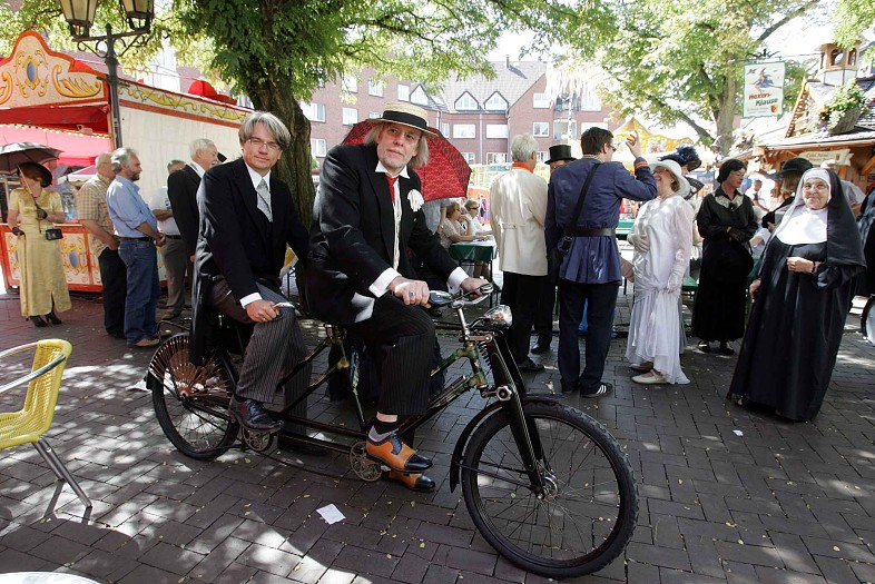 Mit dem Karussell auf Zeitreise Zum zehnten Mal findet die Nostalgiekirmes auf dem Dinslakener Altmarkt statt. Zur Eröffnung ließen sich auch einige historische Persönlichkeiten blicken und wagten sich auf die verschiedenen Fahrgeschäfte. Wenn man sich ganz auf die seltsamen Gestalten konzentriert, die über den Altmarkt laufen, dann könnte man meinen, man befände sich 100 Jahre in der Vergangenheit. Männer mit Gehstöcken, Taschenuhren und Zylinder auf dem Kopf lauschen den Worten von Dr. Ulrich Tekathen. Der Vorsitzende der Interessengemeinschaft (IG) Altstadt spricht einführende Worte. "Der Adel der deutschen Schaustellerei ist hier zusammengekommen", verkündet er. Dann schlüpft er, ebenfalls im Kostüm, zurück in seine Rolle als Ernesto Salzmann, ein Lebemann, der sich von seiner Familie sein Erbe auszahlen ließ und in Richtung Buenos Aires auswanderte. Info: Historische Kostüme Von Betty Tendering (gespielt von Ingrid Hassmann) bis zum Kiepenkerl (Erich Weichert) sind einige historische Figuren auf der Kirmes unterwegs. Für einen schnellen Auftritt auf der Bühne restaurierte die Firma Nellessen ein Tandem aus den 20er-Jahren aus dem Museum Voswickelshof. "Da gibt es noch viele solcher Schätze", sagte Dr. Ulrich Tekathen. Es ist ein Teil der Reise in die Vergangenheit, welche die Nostalgiekirmes ihren Besuchern bietet. Rock-Musik aus den 50er Jahren tönt vom Fahrgeschäft "Super Movie Star" über den Altmarkt. Eine Runde in dem Fahrgeschäft, in dem die Passagiere per Fliehkraft an einen Metallkäfig gedrückt werden, und Matthäus Tekathen, der einen amerikanischen Unternehmer mimt, ist begeistert. "Ich bin über den großen Teich gekommen, um hier nach Innovationen zu suchen. Und dieses Gerät gehört definitiv dazu. Das macht einfach Spaß", sagt er. Besucher der Kirmes, die es ruhiger angehen lassen möchten, werden ebenfalls fündig. Gemächlich geht es auf dem historischen Hängekarussell aus dem Jahre 1928 rund. Per Kutsche können die Gäste durch die Altstadt fahren oder an kleinen Kirmesautomaten beim Boxen oder Gewichtheben ihre Kraft erproben. Und auch das Karrussell für den Nachwuchs bietet ein eher ruhiges Tempo. "Mit dem Kinderkarussell haben wir eine kleine Mogelpackung hier. Das ist nur auf alt getrimmt", verrät Dr. Ulrich Tekathen. Ein spontaner Ersatz für das Riesenrad, das zum runden Geburtstag der Nostalgiekirmes nicht erschienen ist. "Der Schausteller ist im bayerischen Straubing auf einem großen Volksfest. Es hat sich für ihn spontan diese Chance ergeben und die wollten wir ihm nicht nehmen", erläutert Tekathen das Fehlen des Riesenrads. Zwischen Dosenwurf-Stand und Entenangeln zeigte sich auch Dr. Thomas Palotz, der als Vertreter der Stadtverwaltung die Nostalgiekirmes offiziell eröffnete. "Nostalgie und Atmosphäre sind für die Innenstadt unverzichtbare Attribute", sagte der Kämmerer und Baudezernent der Stadt Dinslaken. Selbst im historischen Kostüm erschienen, lobte er die verkleideten Persönlichkeiten auf dem Altmarkt. "Ich werde den Vorschlag machen, dass die Ratssitzungen in Zukunft in solchen Kostümen stattfinden, damit sie mehr Stil bekommen", scherzte er. RP 18.08.2012, Florian Langhoff Gemeinsam mit dem Tandem