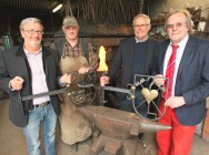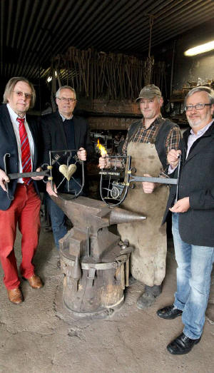 Dr. Ulrich Tekathen, Johannes Niggemeier, Lutz Isselhorst und Detlef Neubauer (von links) präsentieren die beiden neuen Zunftzeichen. FOTO: Martin Büttner Mit den Zunftzeichen der Seiler und der Markthändler fertigte Schmied Lutz Isselhorst die letzten beiden Schmuckstücke für den Maibaum auf dem Dinslakener Altmarkt an. In der Schmiede von Lutz Isselhorst brennt das Feuer noch. Die Arbeit hat der Schmied allerdings schon vollbracht. Am Amboss lehnen die zwei Zunftzeichen für den Maibaum in der Dinslakener Altstadt. "Wenn ich auf den Altmarkt komme, geht mein erster Blick immer zum Maibaum. Wir haben das Projekt 2001 anfangen, und jetzt nähert es sich seinem Abschluss", sagt Dr. Ulrich Tekathen, Vorsitzender der Interessengemeinschaft Altstadt. Denn die zwei neuen Zunftzeichen sind die letzten, die ihren Platz auf dem Altmarkt finden sollen. "Im kommenden Jahr folgt noch das Wappen der Interessengemeinschaft", erklärt Tekathen. |