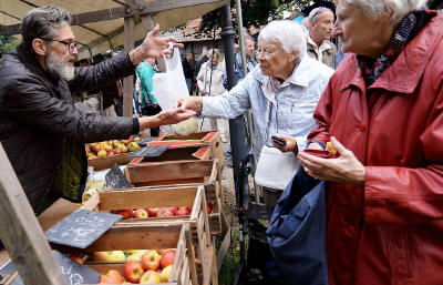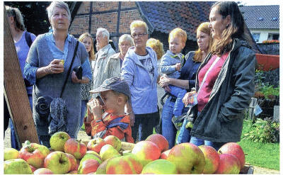 Groß war der Andrang beim Apfelfest am Museum Voswinckelshof. Foto: Lars Fröhlich Es war ordentlich was los auf dem Apfelfest, das Wetter hielt sich trotz schlechter Prognosen und so wagten auch 20 Oldtimer-Trecker-Fahrer die Fahrt zum Museum und sorgten mit ihren Fahrzeugen aus den 50er Jahren für manches "Ah" und "Oh". Und wer aufs Glück hoffte, der war bei Schmied Wolfgang Sikorski an der richtigen Stelle. Hufeisen gab es in Hülle und Fülle vom Schmied der Trabrennbahn. "Unser Museumsschmied hat sich verletzt", erzählt Ulrich Tekathen, "und Wolfgang Sikorski ist netterweise eingesprungen." Nicht den Apfelbaum, aber seinen Kiwistrauch "plünderte" IG-Altstadt-Mitglied Wolfgang Krüsmann und verwandelte die Früchte in einen schmackhaften Kiwi-Likör. Nach dem Erfolg versuchte sich der Pensionär auch an anderen Obstsorten und siehe da die "Dinslaken Destille" war geboren. Gewerbsmäßig vertreibt er seine Dinslaken Burgfräulein, Ritter und Co allerdings nicht, nur bei Festen der IG Altstadt. Und bei Skiffle und Bluegrass der Band Greentown Music schmecken sie nochmal so gut. Birgit Gargitter, NRZ + RP 03.10.2016 |
