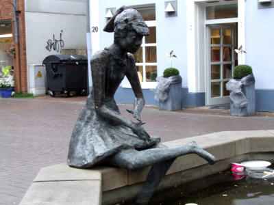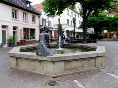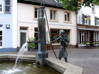 Man schöpfte natürlich nicht nur Wasser. Das Treffen an der Pumpe diente natürlich auch der Kommunikation. Hier wurden Neuigkeiten ausgetauscht. Der Brunnen soll zum Verweilen einladen, wie dies von der abgebildeten Skulptur deutlich gezeigt wird. |