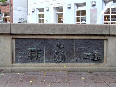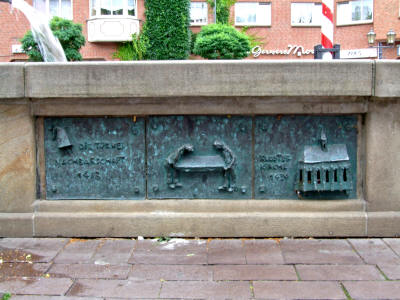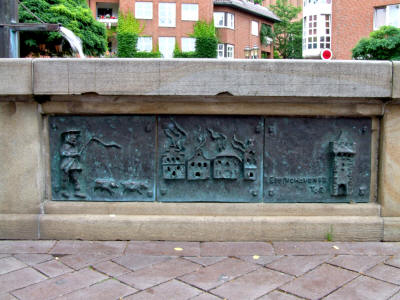 | Sechs Bronzetafeln fehlen noch um die restlichen beiden Seiten des Brunnens zu bestücken. Seit 1985 fehlt jedoch das notwendige Geld hierfür. Es wäre schön, wenn sich im Laufe der Zeit ein oder mehrere Sponsoren hierfür finden würden. Die Trinkwasserversorgung hatte für die Dinslakener Bürger immer schon ein Problem dargestellt: Zum einen floss immer brackiges Wasser aus den vertorften Flussarmen des Rotbachs in das Grundwasser, aber auch die Fäkalien versickerten im Boden. Die Bürger holten sich ihr Wasser an den im Stadtgebiet verteilten Pumpen, woran sich auch im 19. Jahrhunderts noch nichts änderte. Solange Dinslaken ein kleines Städtchen blieb, war der Zustand ganz erträglich - auch wenn die Epidemien im Mittelalte6 wohl immer auf die schlechten hygienischen Verhältnisse zurückzuführen waren. Als aber im 19. Jahrhundert die Bevölkerungszahl stark anstieg, neue Gewerbebetriebe mit Abwasser hinzukamen und vor allem die Zahl der Viehmärkte und auch die des aufgetriebenen Viehs sich sehr erhöhte, spitzte sich die Lage zu. Die Fäkalien all dieser Tiere sickerten einfach in den Boden oder gelangten in die Stadtgräben und damit ins Grundwasser. |