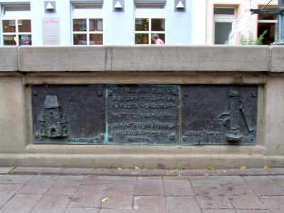 Vier der sechs Außenwände des Brunnens sind mit Bronzetafeln
