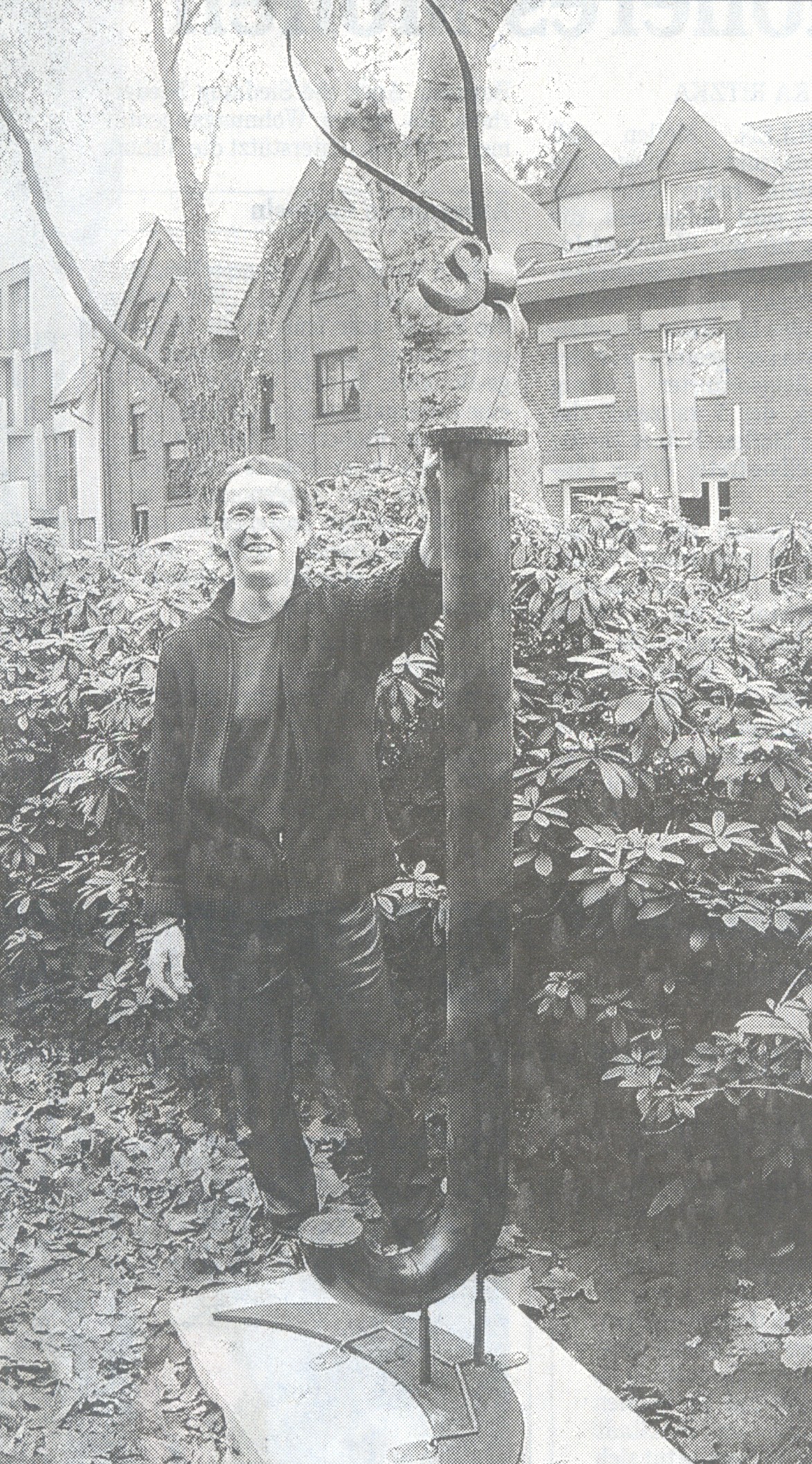 Nach Kuno Langes "Daphne" hat ein weiteres Wesen, dessen Wurzeln in der griechischen Mythologie liegen, sein Ziel erreicht. Hermanns Zentaur ist. kein Einzelgänger. Er entstammt einer sechsköpfigen Familie von Mischwesen, die der Künstler aus Holz- und Stahl gefertigt hat. Und er unterscheidet sich von ihnen. Denn sein Körper besteht ausschließlich aus Stahl. Der Kopf eine Hacke, darauf zwei sichelförmige Fühler, ein massiver Haken als Kinn, der Korpus ein unten gekrümmtes Stahlrohr Das Ganze steht auf einer stählernen Sichel. Die Kreatur verdankt ihr Aussehen nicht nur dem unbändigen Sammeleifer des Künstlers. Hermanns Prinzip, sich von dein Material inspirieren zu lassen, aus Fundstücken ‑ vorgefertigten Formen also ‑ neue entstehen zu lassen, hat sich bewährt. Seine oftmals bizarren Fabelwesen bekommen ständig Zuwachs. "Ich wühle in Materialien", sagt Hermanns. Sein Jagdrevier: Rötzel, Signode, Klöckner, wo immer Stahlabfälle anfallen, wo immer es verbogene, verformte, ausrangierte Werkzeuge zu holen gibt. Hermanns Mischwesen entstehen nicht im Kopf. Die Zentauren wachsen unter den Händen des Künstlers. Anders als die griechischen Fabelwesen die als menschliche Torsi mit Pferdelaibern durch die Mythologie galoppierten, verändern seine Figuren ständig ihre Gestalt. Sie halten sich auch nicht überwiegend in Wäldern auf, sondern bevorzugen Galerien, Ausstellungen oder den öffentlichen Raum. Seit 1988 Jahren sind die Arbeiten des 49-jährigen Künstlers und Kunsterziehers, der an der Hünxer Straße 372 sein Atelier hat, in Einzel‑ und Gemeinschaftsausstellungen zu sehen, unter anderem in Krefeld, Düsseldorf, Köln, Bonn, Aachen, Duisburg Wesel, Essen, Bochum, Mülheim und Dinslaken. Zu den Kunst-Stationen im Ausland zählen New York und verschiedene Städte in Polen. Ralf Schreiner, NRZ