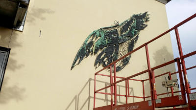 Der Ikarus von Karl Heiduck wurde von der Firma Metallbau Grommes in Voerde restauriert und an der Wand vom Museum Voswinckelshof in Dinslaken angebracht. Foto: Bettina Schack Wirkliche Kunst am Bau Als der Ikarus von seinem alten Platz an der Backsteinwand der Jeannette-Wolff-Schule weichen musste, zeigte sich Museumsleiter Dr. Peter Theißen sicher, dass der Ikarus vor einem anderen Hintergrund gewinnen würde. Er hatte recht. Die ockerfarbene Tünche des Voswinckelshof wirkt wie ein Blatt Papier für die „kolorierte Grafik“ und der Ikarus entfaltet nun erst seine ganze Ausstrahlungskraft als wirkliche Kunst am Bau. Mit den Säulen der