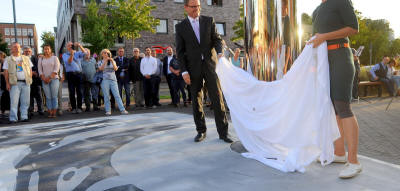 Michael Heidinger und Künstlerin Steffi Schöne enthüllten die Skulptur zum