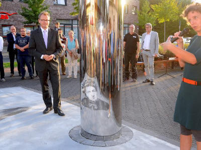 SYMBOL FÜR DINSLAKEN Skulptur wird 2018 errichtet Michael Turek, NRZ 16.10.2017 Das Kunstwerk nach einem Entwurf von Steffi Schöne erinnert an Jeanette Wolff. Technische Gründe haben den Zeitplan durcheinander gebracht. Die Realschule an der Wiesenstraße war lange Zeit der Ort, an dem sich die Erinnerung an Jeanette Wolff festmacht. Die Schule gibt es nicht mehr, dafür aber einen Platz, der nach ihr benannt worden ist. Dort soll eine Skulptur aufgestellt werden, die an die starke Frau erinnern soll. Bereits für diesen Sommer war sie angekündigt. Noch steht sie nicht. Warum das so ist und ob das Projekt vielleicht auf Eis gelegt worden ist, dazu hat Marcel Sturm, Pressesprecher der Stadt, Stellung genommen. Den durchgeführten Wettbewerb hatte Steffi Schöne gewonnen. Bei ihrem Entwurf ist ein verzerrtes Bild der bekannten Dinslakenerin auf dem Boden aufgemalt, erst durch eine Säule aus Edelmetall wird das Portrait von Jeanette Wolff erkennbar. Das Bild soll vier bis fünf Meter breit und der Zylinder aus Metall zwei Meter hoch sein. Er soll einen Durchmesser von 60 Zentimeter haben. Das Projekt sei keineswegs auf „Eis gelegt worden“, so Sturm. Es gebe eine Verzögerung, führt er weiter aus. „Es gilt: Kunst vor Schnelligkeit. Die Gründe dafür sind letztlich als technische Gründe zu bezeichnen“, sagt er. So müsse das Öl, mit dem die Grafik angebracht werden soll, aus dem Asphalt diffundieren, was bis zu zehn Wochen dauern könne. Dabei sei man abhängig von der Witterung. Die Säule selbst wiederum benötige ein adäquates Fundament. In diesem Jahr wird es nichts mehr. Ursprünglich war angedacht, die Skulptur noch in diesem Sommer zu errichten. Die Arbeiten sollten im Juni beginnen, nachdem schon mehrere Ortstermine stattgefunden hatten. Der 22. Juni, an diesem Tag sollten die Arbeiten beginnen, war mit Bedacht gewählt worden: Es ist der Geburtstag von Jeanette Wolff. Nun ist alles in das nächste Jahr verschoben worden. Für die offizielle Übergabe haben sich die Verantwortlichen erneut einen besonderen Tag ausgesucht. Als Termin ist der 19. Mai vorgesehen. Dabei handelt es sich um den Todestag von Jeanette Wolff. |