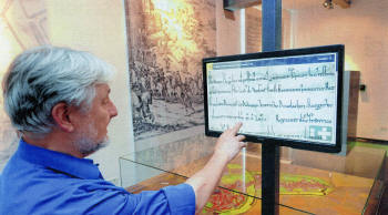 Museumsleiter Dr. Peter Theißen beim Rundgang durch die Dauerausstellung - Foto: Heiko Kempken Neben den frühgeschichtlichen Funden, dem Stadtmodell mit neuem Schubladensystem, das den Vergleich mit historischen Karten erlaubt, und Münzen wie dem Dinslakener Pfennig liegt der Schwerpunkt eindeutig im Arbeitsleben der Dinslakener. Von der Backstube im Obergeschoss, die in Zusammenarbeit mit der Familie Schollin entstand, über die Stahlindustrie in Dinslaken bis zur Lohberger Zeche. Ein eigener Raum ist dem jüdischen Leben gewidmet. Auch zu hören gibt es so einiges im Museum, wenn der jüdische Viehhändler mit dem Bauern ins Gespräch kommt und sie auf die aktuelle wirtschaftliche und politische Lage zu sprechen kommen. „Zwei Schauspieler der Burghofbühne haben die fiktiven Figuren zum Leben erweckt, Joachim Schulz-Marzin hat das Drehbuch dafür geschrieben“, erzählt Museumsleiter Dr. Peter Theißen. Für Gänsehaut sorgen die Augenzeugenberichte im O-Ton, die entweder über den Kopfhörer oder über ein Außenmikrofon zu hören sind. Per Animation ist auch ein Rundgang durch das von den Nazis zerstörte Waisenhaus möglich. Besonders stolz ist Theißen auf seine Vitrine zur jüdischen Geschichte mit einer Stoffrolle Judensterne aus dem Nachlass von Jeanette Wolff. |