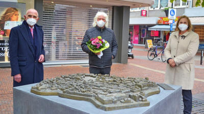 Bürgermeisterin Michaela Eislöffel bedankte sich bei Initiator Helmut Dismer (li.) und Künstler Egbert Broerken. FOTO: Stadt Dinslaken Auf Initiative des Rotary-Clubs Wesel/Dinslaken wurde die Idee an die Stadt Dinslaken herangetragen, ein zu ertastendes Modell der Innenstadt erstellen zu lassen. Das bronzene Stadtmodell wurde durch den Bildhauer Egbert Broerken fertiggestellt und am Neutorplatz aufgestellt. Das Modell mit dem Maßstab 1:600 hat eine Größe von 125 mal 180 Zentimeter und stellt die drei Quartiere Altstadt, Neustadt und Bahnhofsumfeld dar. |