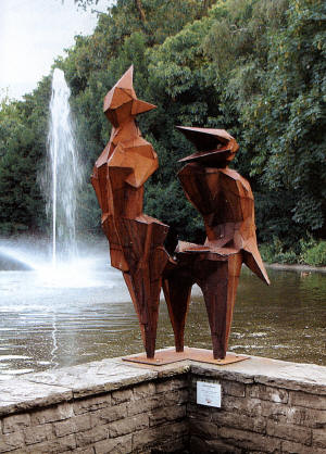 Die „Streithähne“ sind Teil eines Skulpturenwegs, der im Jahr 2002 von der Stadt zunächst als temporäre Ausstellung gedacht war. Die Dinslakener selbst sollten darüber abstimmen, welche. der Kunstwerke dauerhaft in der Stadt verbleiben sollten – die „Streithähne“ lagen in der Abstimmung mit 33 Prozent der Stimmen mit Abstand vorne. Dass letztendlich alle Skulpturen im Stadtbild erhalten blieben, war dann der Verdienst vieler Sponsoren. Die Mülheimer Künstler Kuno Lange und Klaus Jost, der inzwischen sein Atelier in Oberhausen hat, sind mit Einzelarbeiten im Skulpturenweg vertreten, aber die „Streithähne“ Waren der gemeinsame große Wurf. Ein „Guckmal“, das sich harmonisch in seine Umgebung einfügt, eine leicht verständliche Aussage hat und damit den Zugang für alle Passanten erleichtert und zusätzlich noch den „Eingeweihten“ eine augenzwinkernde Botschat sendet. Wobei: Als Lange und Jost die „Streithähne“ schufen, hatten sie derlei Zwieträchtiges gar nicht im Sinn. „Die ‘Streithähne’ sind Teil eines gemeinsamen Projekts von Kuno Lange und mir, in dem wir uns auf eine fiktive Reise um die Welt auf den Spuren von Charles Darwin begaben“, erinnert sich Jost anlässlich des Starts der „Guckmal“-Serie. Was die beiden in ihrer Zusammenarbeit entdeckten, waren 20 bis 30 „Schräge Vögel“ in allen Größen, die Dinslakener Plastik ist die größte der Serie. Und mit Streit hatte das damals nichts zu tun. Diese Assoziation hätten erst die Dinslakener Bürger gehabt, so Jost. Die „Schrägen Vögel“ waren eine vielleicht etwas skurrile, aber auf jeden Fall harmonische Angelegenheit. „Wir haben gemeinsam am Schweißgerät gestanden und überlegt, wie wohl das eine oder andere Teil zusammenpassen könnte — und das ohne Streit! Doch auch an den schrägsten Vögeln nagte irgendwann der Zahn der Zeit. Wie alle Kunst im öffentichen Raum fordern sie Beachtung, aber mehr noch Pflege ein. Bereits 2007 wurden die Streithähne umfassend saniert, ihre Oberfläche erhielt einen neuen Anstrich. Und als der Ententeich neugestaltet wurde, stand sogar ein kleiner Umzug an, da die Mauer, auf der sie ursprünglich standen, abgebaut wurde. Die Streithähne aber wurden auf einen Sockel erhoben. |