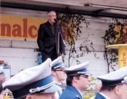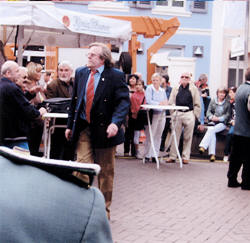 moderierte wie schon in früheren Jahren die Veranstaltung. Im Vordergrund das Tambourcorps Voerde 1910, das die Schützen vom BSV 1461 und die Karnevalisten der KG Rot Gold bei ihrem Aufzug auf dem Altmarkt begleiteten. |