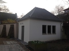 Voswinckelshof 2008 konnte in der Bollwerkskate der neue Holzbackofen eingeweiht und in Betrieb genommen werden. Schnell wurde allen Beteiligten klar, Brotbacken ist ja gut und schön, aber wo bereiten die Gruppen ihren Teig vor? Der Raum, in dem der Backofen steht ist hierfür nicht geeignet! Schnell hatte man schon ein Gemäuer im Blick: Die Arbeitsstätte des letzten Elfenbeinschnitzers in Dinslaken. Bei näherer Betrachtung war das in unmittelbarer Nachbarschaft zur Bollwerkskate gelegene Gebäude, es sah für alle Betrachter immer wie eine Garage aus, zu baufällig, um es baulich entsprechend herzurichten. Aber, wo ein Wille ist, ... In der Vergangenheit hat es sich immer bewährt, Gleichgesinnte und Partner zu suchen und an einen Tisch zu holen. Das Ziel war klar: Abbruch und Neubau eines Gebäudes, das ins Umfeld passt, und Herrichtung als Backstube. |