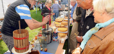 Leckerer Kuchen, Saft oder Mus: Das traditionelle Apfelfest findet jedes Jahr zum Erntedankfest statt. Foto: Heiko Kempken „Wenn ich wüsste, dass morgen die Welt unterginge, würde ich heute noch ein Apfelbäumchen pflanzen“, soll Martin Luther gesagt haben. Anlässlich des Lutherjahres nahm Dr. Ulrich Tekathen, Vorsitzender der IG Altstadt und Organisator des Apfelfestes, diesen Satz wörtlich und war dankbar, dass das Grünflächenamt ihm sofort die Erlaubnis dazu erteilte. Zu Ehren des Apfels erschien Bürgermeister Dr. Michael Heidinger im schwarzen Anzug, um auf dem Vorplatz des Museums Voswinkelshof einen Apfelbaum zu pflanzen. Im Reformationsjahr wurde der Apfelbaum zur Erinnerung an die beiden Reformationsdaten 1517 und 1817 gepflanzt. Die evangelische Kirche vereinigte sich vor 200 Jahren wieder aus den verschiedenen Strängen von reformierter und lutherischer Kirche. „Auch heute leben wir wieder in einer Zeit der Umbrüche“, sagte Dr. Ulrich Tekathen: „Der Baum symbolisiert auch unsere Dinslakener Altstadt, sie soll wie dieser Baum blühen und gedeihen.“ Jahr für Jahr wächst das Netzwerk rund um das Apfelfest Bis der Lutherbaum groß genug ist, kommen die Äpfel für den frisch gepressten Saft weiterhin von Bauernhöfen aus der Region. Frischer Apfelsaft, Reibekuchen mit Apfelmus, ein Kuchenbuffet mit den unterschiedlichsten Apfelkuchen und verschiedene Sorten Äpfel verwöhnten die Besucher beim jährlich stattfindendem Traditionsfest. Jahr für Jahr wächst das Netzwerk rund um die Veranstaltung, die jedes Jahr zum Erntedankfest stattfindet. Es kommen immer wieder neue Leute hinzu, die sich einbringen.